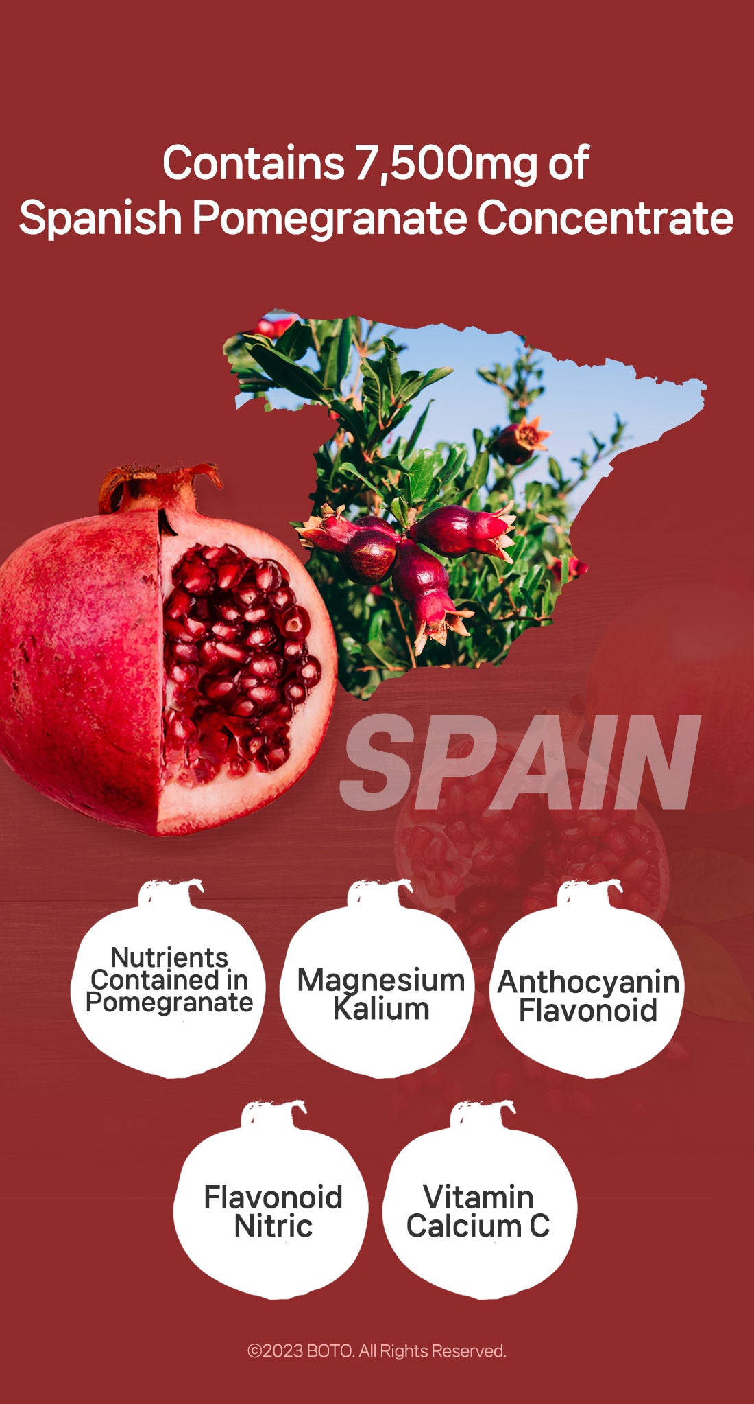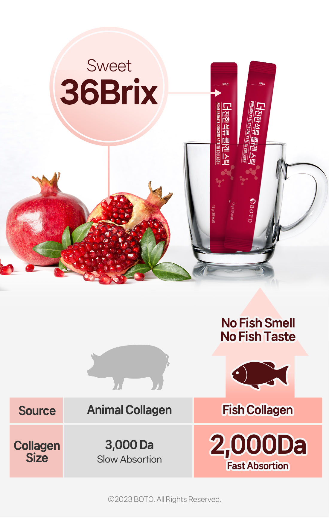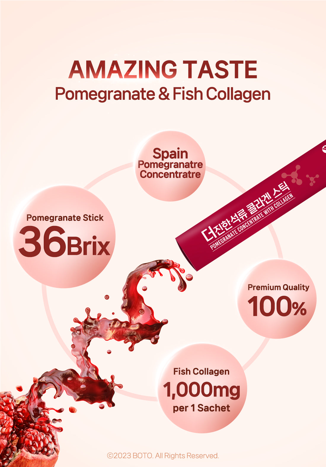 -石榴浓缩液 + 胶原蛋白合二为一!: 高 每支 36 Brix 含有 100% 西班牙石榴浓缩液和 1,000mg 2,000Da 低分子鱼胶原蛋白